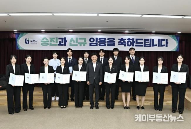 케이부동산뉴스 김교민 기자 | 부천시는 지난 23일 부천시청 소통마당에서 2025년 10월 1일자 인사발령에 따른 임용장 수여식을 열고, 5급 승진자 2명(직원복지과 후생복지팀장 박미경, 주차지도과 주차행정팀장 이순임)과 신규 임용자 16명에게 임용장을 전달했다.