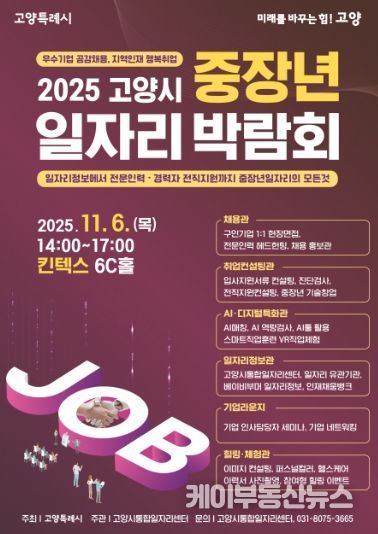 케이부동산뉴스 김교민 기자 | 고양특례시는 오는 11월 6일 킨텍스 제2전시장 6C홀에서 열리는‘2025 고양시 중장년 일자리박람회’에 참여할 구인기업을 모집한다고 밝혔다.