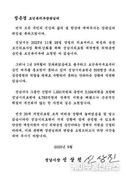 이어 “성남시의료원이 지역 상황에 맞게 운영될 수 있도록 단순한 재정지원이 아닌 위탁운영 승인이라는 정책적 지원이 반드시 필요하다”며 “이와 관련해 장관님과의 면담을 요청드린다”고 밝혔다.