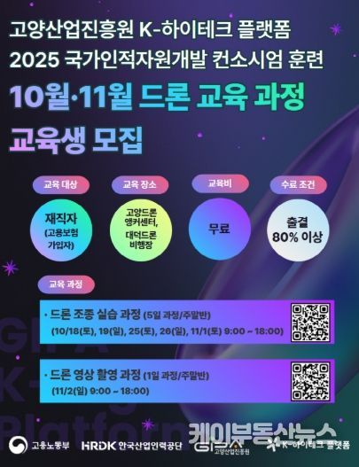 케이부동산뉴스 김교민 기자 | 고양산업진흥원 K-하이테크플랫폼지원단이 고용노동부와 한국산업인력공단이 주관하는 국가인적자원개발 컨소시엄 사업의 일환으로, 드론·생성형 AI 교육과정 교육생을 모집한다고 밝혔다.