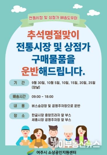 케이부동산뉴스 김교민 기자 | 여주시는 여주시소상공인지원센터 주관으로 다가오는 추석 명절을 맞이하여 전통시장과 상점가를 찾는 시민들의 편의를 돕고 전통시장 활성화를 위해 ‘전통시장 및 상점가 배송 도우미’ 서비스를 운영한다.