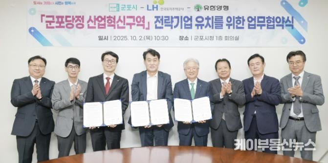 케이부동산뉴스 김교민 기자 | 군포시는 2일 군포시청에서 한국토지주택공사(LH), ㈜유한양행과 ‘군포당정 산업혁신구역’ R·D 전략기업 유치를 위한 업무협약을 체결했다고 밝혔다.