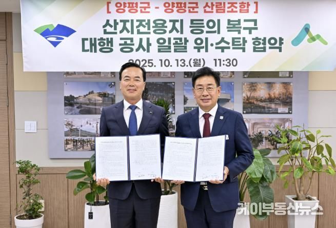 케이부동산뉴스 김교민 기자 | 양평군은 지난 13일 양평군청에서 양평군산림조합과 ‘산지전용지 등의 복구 대행 공사’에 대한 위·수탁 협약을 전국 최초로 체결했다고 밝혔다.