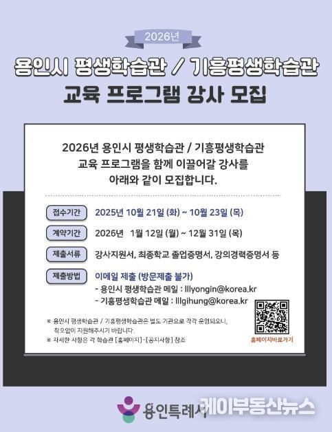 케이부동산뉴스 김교민 기자 | 용인특례시는 21일부터 23일까지 3일간 ‘2026년 평생학습관 프로그램’을 운영할 강사를 모집한다고 15일 밝혔다.