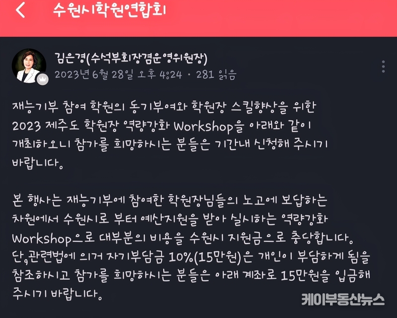 특히 학원연합회 수석부회장을 겸하고 있는 김은경 수원특례시의회 의원(더불어민주당, 세류1·2·3·권선1동)이 '수원시학원연합회 회원 단체방'에 직접 공지를 올려 “관련법상 자기부담금 10%(15만원)를 부담해야 한다”고 안내한 사실이 확인되면서, 법적 근거 없는 회비 징수 논란이 커지고 있다.