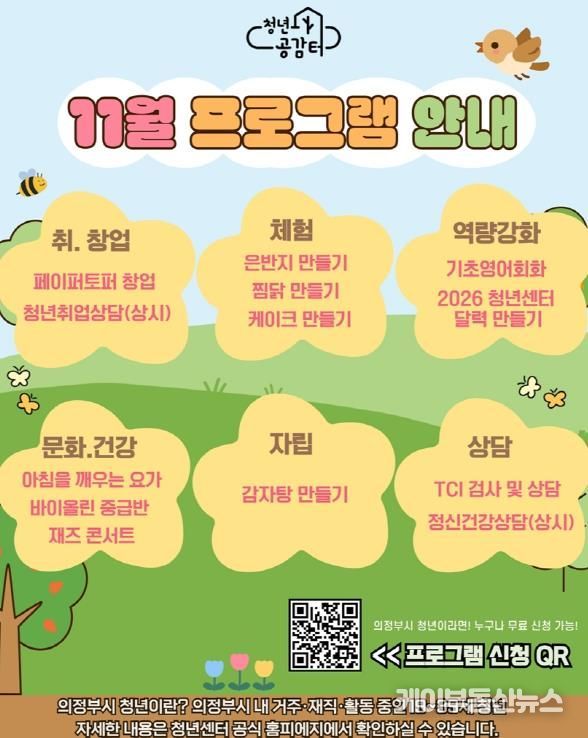 케이부동산뉴스 김교민 기자 | 의정부시 청년센터 청년공감터는 개관 4주년을 기념해 10월 24일부터 11월 특별프로그램에 참여할 청년을 모집한다.