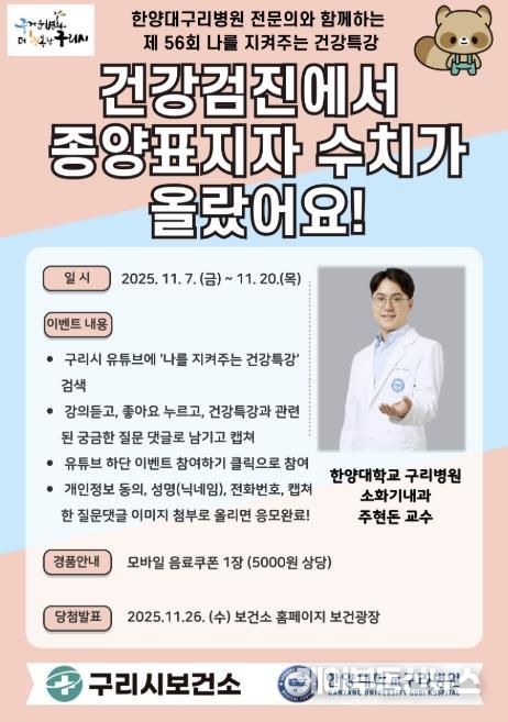 케이부동산뉴스 김교민 기자 | 구리시는 시민의 암 예방과 건강관리 역량 강화를 위해, 오는 7일 한양대학교구리병원 소화기내과 주현돈 교수를 초청해 ‘건강검진에서 종양표지자 수치가 올랐어요!’를 주제로 한 건강특강을 구리시 공식 유튜브 채널 ‘구리비전’을 통해 송출한다.