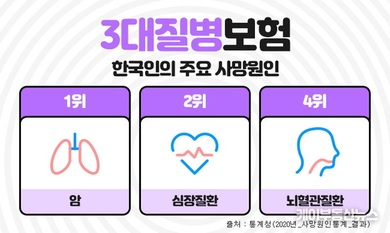 케이부동산뉴스 김교민 기자 | 한국인의 주요 사망원인중에 암, 뇌혈관질환, 심혈관질환은 흔히 3대질병이라 일컬어지며 살아가면서 가장 먼저 대비해야 하는 중대질병으로 항상 강조되고 있다. 이들 질병에 미리 대비하기 위해 가입하는 것이 진단비보험인데, 이러한 3대질병진단비를 중점으로 보장하는 보장성보험이 3대진단비보험 이다. 3대질병진단비보험은 각각의 질병에 주목해서 보장하기도 하지만, 나에게 맞는 추가 특약을 잘 골라서 가입한다면 종합건강보험으로도 충분히 활용도가 높다.