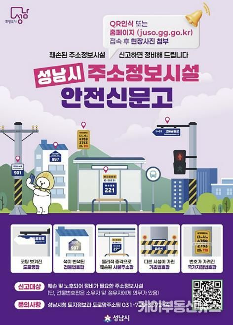 케이부동산뉴스 김교민 기자 | 성남시는 도로명주소 안내시설물의 체계적 관리와 시민 안전 확보를 위해 ‘성남시 주소정보시설 안전신문고’를 상시 운영한다고 4일 밝혔다.