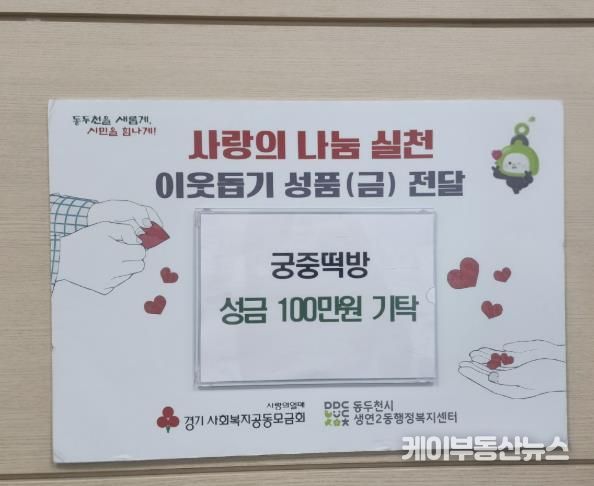케이부동산뉴스 김교민 기자 | 동두천시 생연2동 궁중떡방은 겨울철 취약계층의 생활 안정을 위해 사용해 달라며 성금 100만 원을 기부했다.