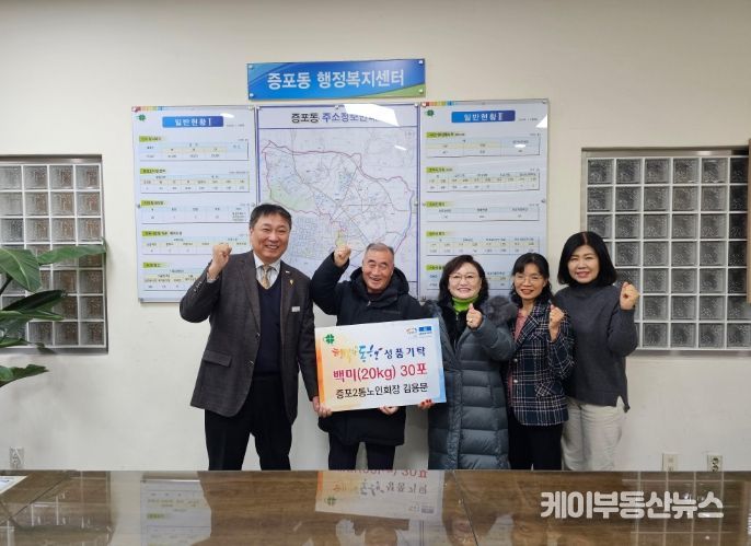 케이부동산뉴스 김교민 기자 | 이천시 증포동은 지난 12월 19일 증포동행정복지센터에서 증포2통 노인회 김용문 회장이 관내 취약계층을 위해 백미(20kg) 30포를 기탁했다고 밝혔다.