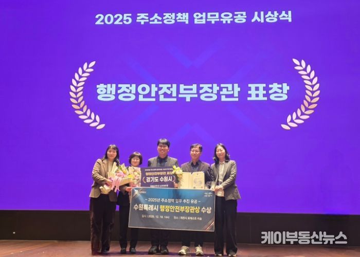 케이부동산뉴스 김교민 기자 | 수원특례시가 행정안전부 주관 ‘2025 주소정책 워크숍’에서 ‘2025 주소정책 업무 분야 우수기관’으로 선정돼 행정안전부 장관 표창을 받았다. 특별교부세 4000만 원도 확보했다.