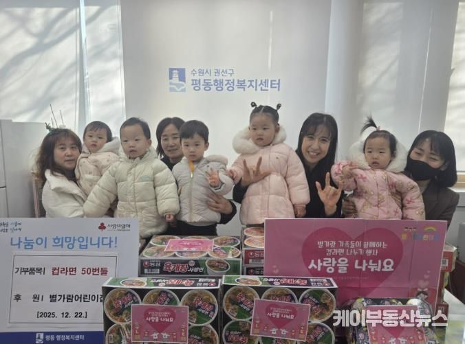 케이부동산뉴스 김교민 기자 | 지난 22일 별가람어린이집에서는 연말연시를 맞이하여 이웃 돕기 후원 물품 컵라면 50 상자를 평동 행정복지센터에 전달했다.