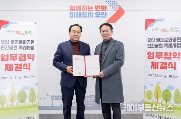 케이부동산뉴스 김교민 기자 | 오산시는 12월 19일 오산시청에서 궐동문화공원 민간공원조성 특례사업의 원활한 추진을 위해 사업 시행자인 ㈜에스디피디와 협약을 체결했다.