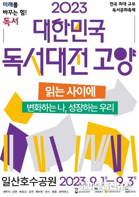 국내 최대 규모 독서문화축제인 ‘2023 대한민국 독서대전 고양’이 9월 1일(금)부터 3일(일)까지 일산호수공원 일원에서 개최된다. 올해 10회를 맞이하는 독서대전은 ‘읽는 사이에-변화하는 나, 성장하는 우리’를 주제로 펼쳐지고, 강연·북토크, 북마켓, 공연, 전시, 체험, 콘퍼런스(학술회의) 등 총 8개 분야, 56여 개 프로그램을 운영한다.