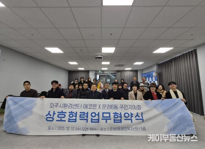 케이부동산뉴스 김교민 기자 | 운정6동 주민자치회는 12월 17일 오전 10시, 운정6동 행정복지센터에서 파주시환경센터 ‘에코온’과 ‘지역 환경 의제 실천 및 기후행동 협력을 위한 업무협약’을 체결하고, 이어 마을 소식지 '초롱꽃향기로' 2호 제작 성과공유회를 개최했다.