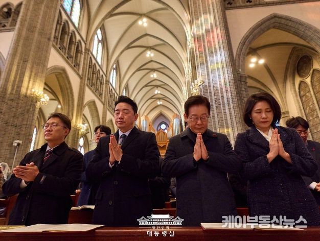 케이부동산뉴스 김교민 기자 | 이재명 대통령과 김혜경 여사가 25일 서울 중구 명동대성당에서 열린 성탄 대축일 미사에서 기도를 하고 있다.