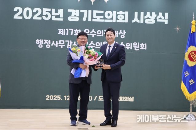 케이부동산뉴스 김교민 기자 | 경기도의회 교육기획위원회 이택수 의원(국민의힘, 고양8)과 성기황 의원(더불어민주당, 군포2)이 26일 열린 2025년 경기도의회 시상식에서 ‘2025년 행정사무감사 우수위원’으로 선정됐다.