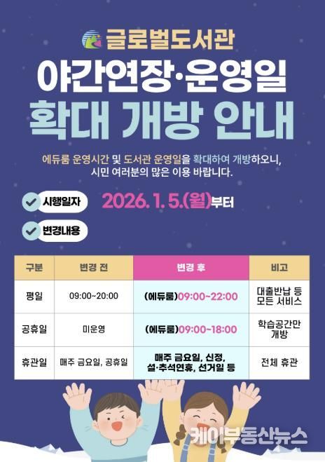 또한, 글로벌도서관은 기존 공휴일에 운영되지 않던 에듀룸 학습공간을 오전 9시부터 오후 6시까지 개방해 학생과 시민들의 안정적인 학습 활동을 지원할 계획이다.