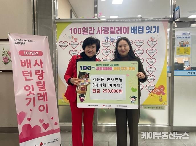 케이부동산뉴스 김교민 기자 | 의정부시 가능동주민센터는 12월 29일 더리체 비바체가 관내 어려운 이웃을 돕기 위해 성금 25만 원을 기탁하며 ‘100일간 사랑릴레이 배턴 잇기’에 동참했다고 밝혔다.