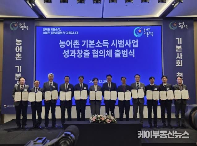 행사에서는 기본사회 강연을 시작으로 농어촌기본소득 시범사업 추진계획과 지역별 특화모델 운영 방향, 연구단 구성·운영 및 정책평가 계획이 공유됐다. 이어 농식품부–경인사연–10개 군이 참여하는 업무협약 체결과 협의체 출범 퍼포먼스, 기념촬영이 진행됐다.