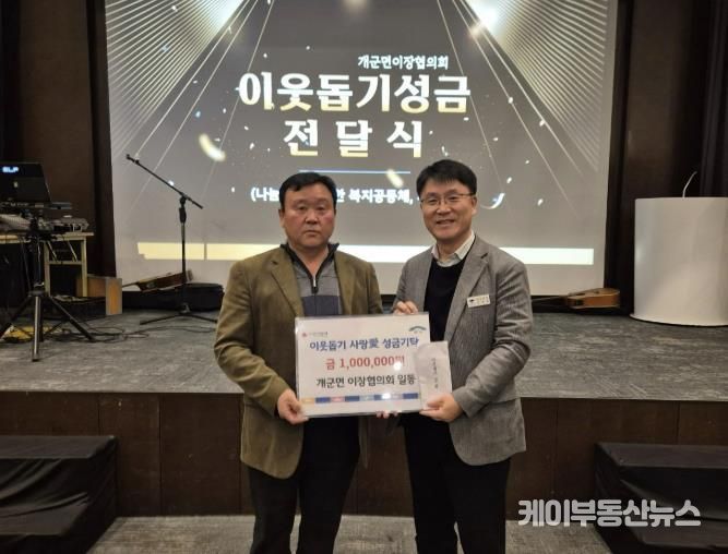 케이부동산뉴스 김교민 기자 | 양평군 개군면은 새해를 맞아 개군면 이장협의회가 지역 내 어려운 이웃을 돕기 위해 성금 100만 원을 기탁하며 따뜻한 나눔을 실천했다고 밝혔다. 기탁된 성금은 개군면 내 취약계층을 위한 복지 지원에 사용될 예정이다.