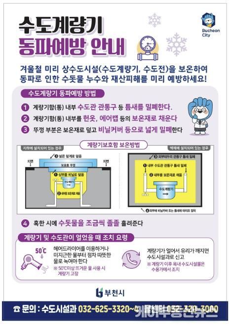 부천시 관계자는 “수도계량기 동파는 사전 예방이 무엇보다 중요한 만큼 시민의 관심과 참여가 필요하다”며 “시는 빈틈없는 대응체계를 유지해 동파로 인한 불편을 최소화하겠다”고 말했다.