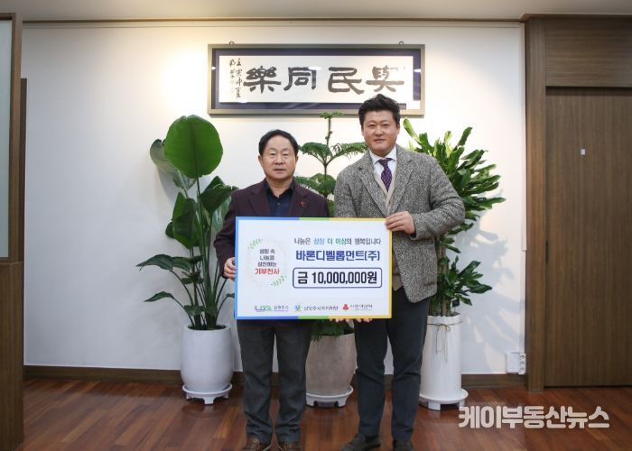 케이부동산뉴스 김교민 기자 | 남양주시는 5일 바른디벨롭먼트 주식회사가 지역 내 취약계층 지원을 위해 후원금 1천만 원을 남양주시복지재단에 기탁했다고 밝혔다.