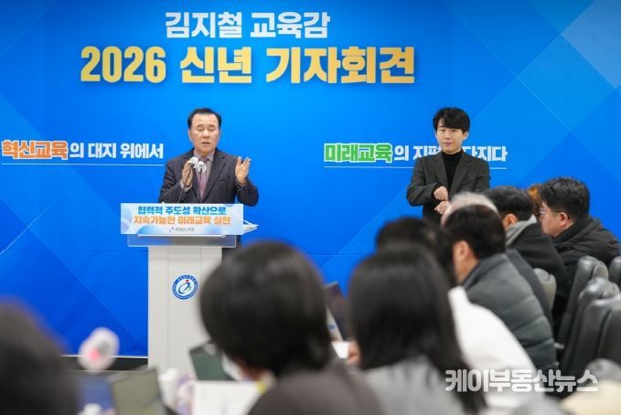 케이부동산뉴스 김교민 기자 | 김지철 충남교육감은 8일, 도교육청 회의실에서 ‘2026 신년 기자회견’을 열고, ‘2025년 주요 성과와 2026년 12대 중점 추진 과제’를 발표했다.