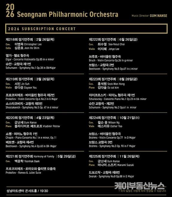 2026년 총 8회 정기공연 라인업을 확정하고, 1월 12일 오후 2시 시즌권을 놀(NOL) 티켓을 통해 오픈한다. 성남시향의 예술총감독 금난새 지휘자를 비롯하여 이병욱, 서진, 백윤학, 최수열, 홍석원, 윌슨 응의 지휘와 첼리스트 심준호, 바이올리니스트 유다윤, 피아니스트 블라디미르 페트로프, 바이올리니스트 이지혜, 피아니스트 김다솔, 바이올리니스트 에스더유, 피아니스트 마나미 스즈키 등의 화려한 협연자를 초청하여 올해 최고의 정기연주회를 마련한다.