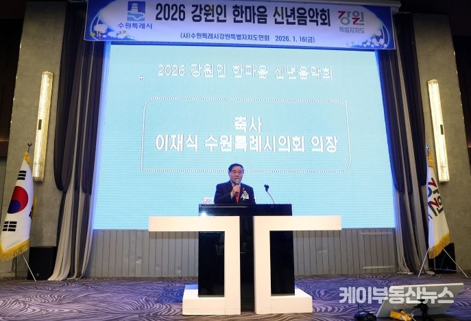 케이부동산뉴스 김교민 기자 | 수원특례시의회는 1월 16일수원컨벤션센터에서 열린 '2026 강원인 한마음 신년음악회'에 참석했다. 이번 행사는 수원특례시 강원특별자치도민회가 주최한 신년 행사로, 이재식 의장을 비롯한 내빈과 강원 출신 시민 등 약 250여 명이 참석한 가운데 신년음악회, 표창 수여, 만찬 등의 순서로 진행됐다.