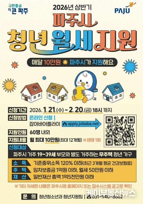 케이부동산뉴스 김교민 기자 | 파주시는 주거비 부담으로 어려움을 겪고 있는 19~39세 청년 가구를 대상으로 월 최대 10만 원씩 최대 12개월간, 총 120만 원의 월세를 지원한다.