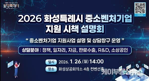 케이부동산뉴스 김교민 기자 | 화성특례시가 관내 중소기업과 소상공인의 경영 애로 해소와 지원사업 활용도를 높이기 위해 오는 26일 화성상공회의소 컨벤션홀에서 ‘2026년 화성특례시 중소벤처기업 지원 시책 설명회’를 개최한다.