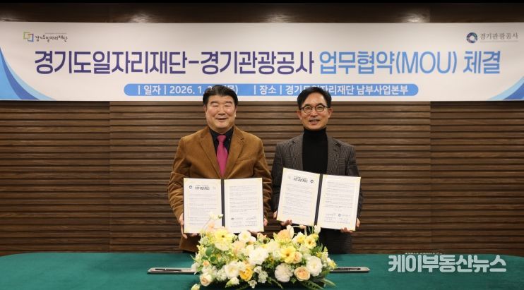 케이부동산뉴스 김교민 기자 | 경기도일자리재단과 경기관광공사는 22일 경기도일자리재단 남부사업본부에서 ‘경기북부 관광 활성화 및 유연근무 확산을 위한 업무협약(MOU)’을 체결했다.