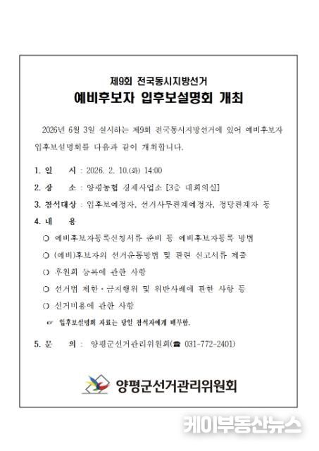 케이부동산뉴스 김교민 기자 | 양평군선거관리위원회는 2월 10일 14:00 양평농협 경제사업소 3층 대회의실에서 2026. 6. 3. 실시하는 제9회 전국동시지방선거와 관련하여 입후보예정자들에게 (예비)후보자등록 및 선거운동방법 등에 관한'예비후보자 입후보설명회'를 개최한다고 밝혔다.