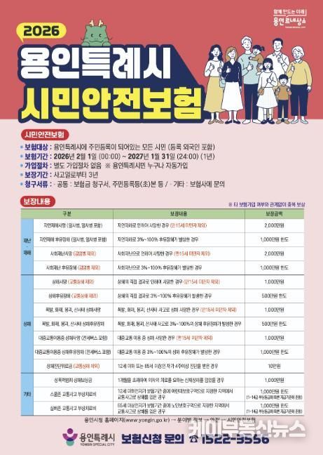 케이부동산뉴스 김교민 기자 | 용인특례시는 각종 재난과 사고로 피해를 본 시민의 생활 안정을 지원하기 위해 시민안전보험에 가입했다고 2일 밝혔다.