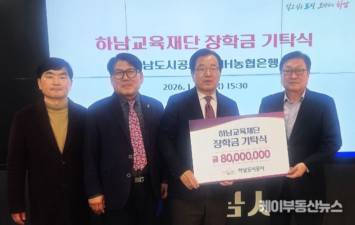 케이부동산뉴스 김교민 기자 | 하남교육재단은 29일 하남시청에서 하남도시공사로부터 하남시 미래인재육성을 위해 장학금과 캠퍼스투어 운영을 위한 기부금 8천만 원을 전달받았다.