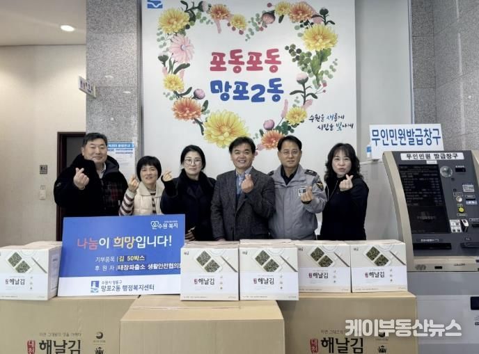 케이부동산뉴스 김교민 기자 | 영통구 망포2동 행정복지센터는 지난 2일, 태장파출소 생활안전협의회가 설 명절을 맞아 저소득 가정을 지원하기 위해 김 50박스를 망포2동 행정복지센터(동장 이용태)에 기탁했다고 밝혔다.