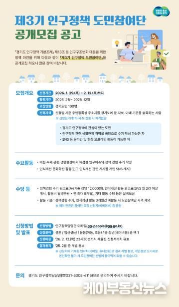 케이부동산뉴스 김교민 기자 | 경기도가 정책 대상자가 직접 정책개선에 참여하는 ‘제3기 인구정책 도민참여단’ 100명을 공개 모집한다.