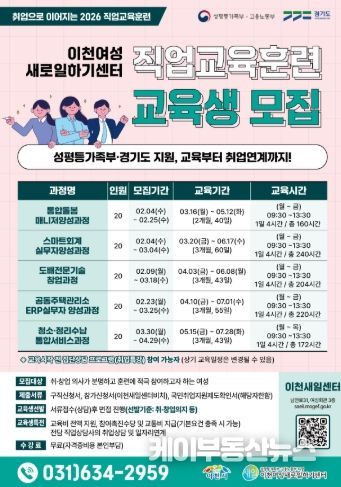 케이부동산뉴스 김교민 기자 | 이천여성새로일하기센터는 경력 단절 여성의 직업능력 개발과 취·창업 연계를 위해 2026년 직업교육훈련 교육생을 모집한다.