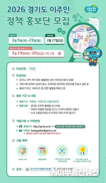 케이부동산뉴스 김교민 기자 | 경기도이민사회통합지원센터에서 오는 23일까지 ‘2026 경기도 이주민 정책 홍보단’ 15명을 모집한다.