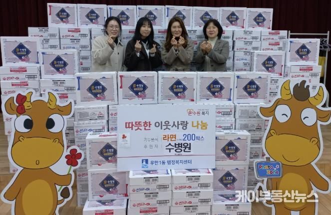 케이부동산뉴스 김교민 기자 | 수병원은 지난 4일, 설 명절을 맞아 어려운 이웃들을 위해 라면 200박스를 우만1동 행정복지센터에 기부하며 이웃사랑을 실천했다.
