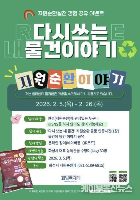 화성특례시는 지난해 시민이 직접 실천한 자원순환 경험을 공유하는'내가 실천한 자원순환 이야기'를 운영하며, 분리배출, 재사용, 나눔 등 생활 속 실천 사례를 중심으로 자원순환에 대한 시민 공감대를 형성해 왔다. 올해 진행되는 '다시쓰는 내 물건 이야기'는 이러한 흐름을 이어가는 캠페인으로, 연간 자원순환 활동의 출발점 역할을 할 예정이다.