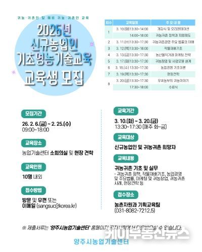 케이부동산뉴스 김교민 기자 | 양주시는 농촌지역으로 이주한 귀농․귀촌인과 예비 귀농인의 안정적인 농촌 정착을 지원하기 위해 ‘2026년 신규농업인 기초영농기술교육’ 교육생을 모집한다.