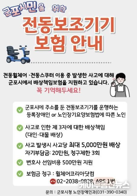 케이부동산뉴스 김교민 기자 | 군포시는 전동휠체어와 전동스쿠터 등 전동보조기기를 사용하는 장애인 및 노인장기요양보험법에 따른 노인을 대상으로 배상책임보험을 지원한다.