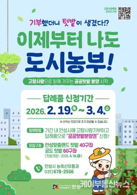 케이부동산뉴스 김교민 기자 | 안성시는 오는 2월 19일부터 고향사랑기부제를 통해 도시농업을 체험하는 ‘도시농부’를 모집한다고 밝혔다.