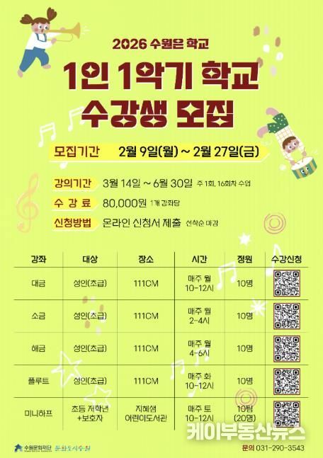 케이부동산뉴스 김교민 기자 | 수원문화재단이 오는 27일까지 시민 누구나 참여할 수 있는 ‘2026 수원은학교 1인 1악기 학교’ 수강생을 선착순으로 모집한다.
