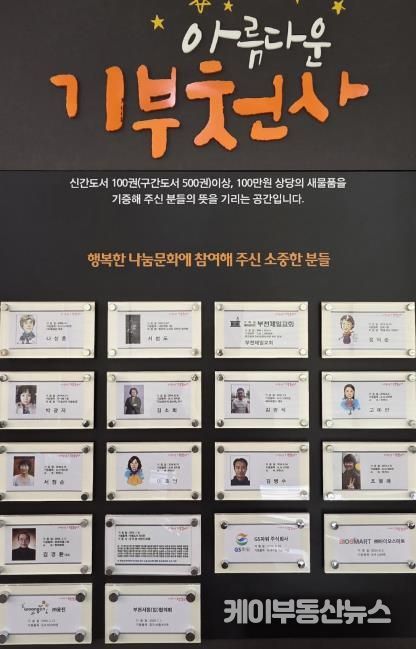 케이부동산뉴스 김교민 기자 | 부천시는 기증자에 대한 감사의 뜻을 전하고 기부 문화를 확산하기 위해 상동도서관 1층 로비에 설치된 ‘아름다운 기부천사’ 게시판에 신규 기증기관 2곳인 ㈜웅진과 부천서점(업)협의회를 등재했다고 10일 밝혔다.