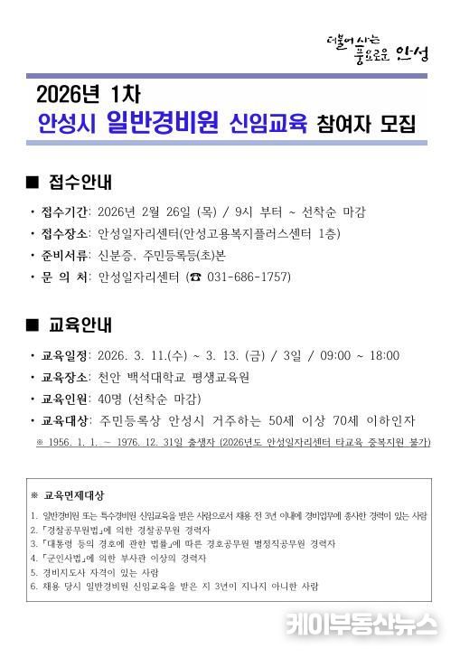 케이부동산뉴스 김교민 기자 | 안성시는 관내 구직자의 안정적인 일자리 창출을 위해 오는 2월 26일부터 '2026년 제1차 안성시 일반경비원 신임 교육' 교육생을 모집한다고 밝혔다.