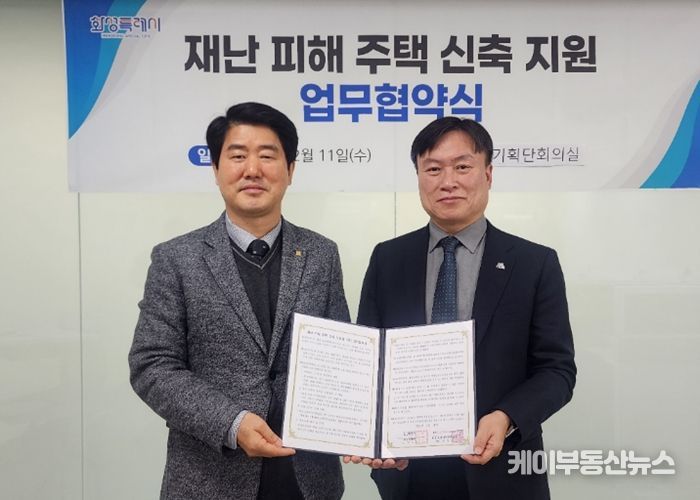 케이부동산뉴스 김교민 기자 | 화성특례시는 11일 시청 총괄기획단회의실에서 화성·오산지역건축사회와 함께 재난 피해 주택의 신속한 복구와 시민의 조기 주거 안정을 지원하기 위한 업무협약을 체결했다.